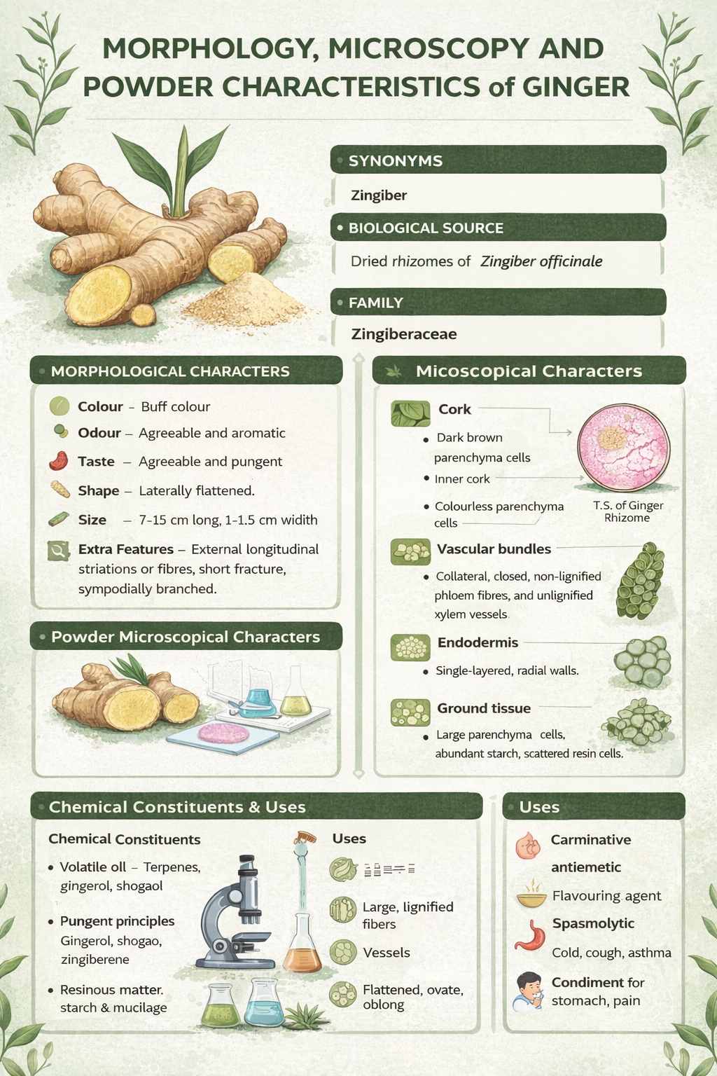 Ginger consists of the dried rhizomes of the Zingiber officinale Roscoe, belonging to family Zingiberaceae.