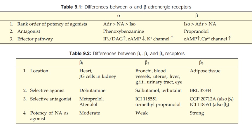 Ahlquist (1948), on the basis of two distinct rank order of potencies of adrenergic agonists (Fig. 9.3), classified adrenergic receptors into two types α and β. This classification was confirmed later by the discovery of selective α and β adrenergic antagonists. Important features of α and β receptors are given in Table 9.1.