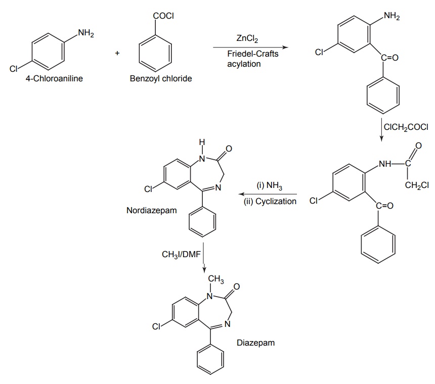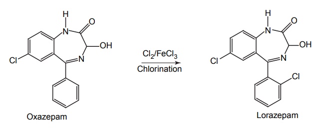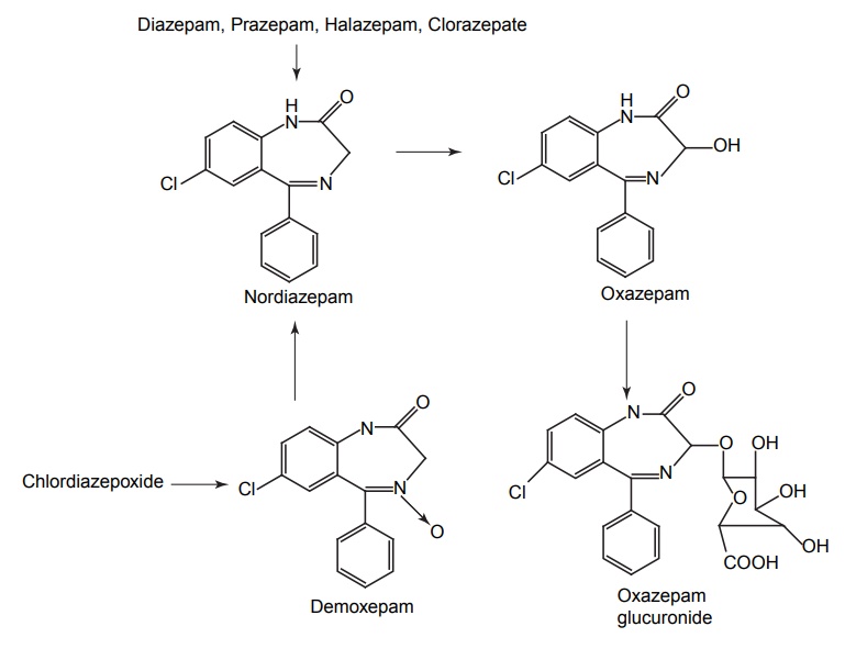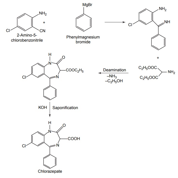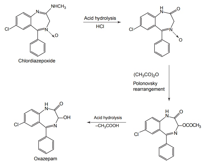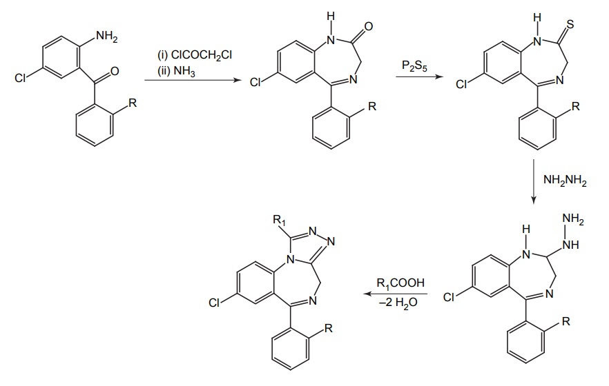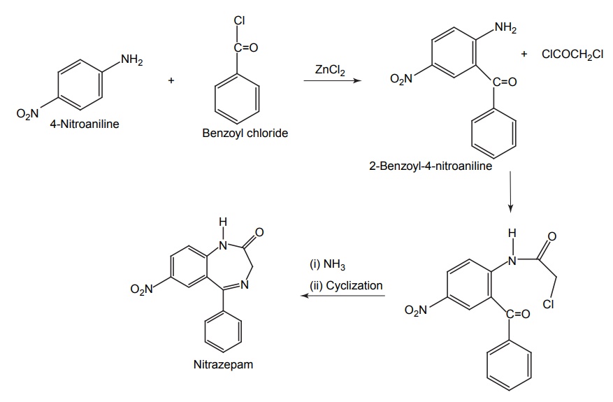 II. Benzodiazepines Mode of action: Benzodiazepine receptors are present in the brain and they form a part of GABAA receptor’s chloride ion channel macromolecular complex. Binding of benzodiazepines to these receptors produces activation of GABAA receptor and increases chloride conductance by increasing the frequency of opening chloride ion channel. These in turn inhibit neuronal activity by hyper-polarization and de-polarization block. Metabolism of Benzodiazepines: Compounds without the hydroxyl group are nonpolar, and undergoes hepatic oxidation. Compounds with hydroxyl groups have more polarity and are readily converted into the glucuronide conjugates and excreted easily. These compounds are also metabolized by 3-hydroxylation of benzodiazepine ring. Synthesis Properties and uses: It is a white or almost white crystalline powder soluble in ethanol and very slightly soluble in water. It is used as a skeletal muscle relaxant, anticonvulsant and antianxiety agent. It may take a long time to achieve sedative and antianxiety effects, during which time the patient can usually be maintained by giving the drug once or twice a day. Patients on the drug should be cautioned not to drive an automobile or to operate dangerous machinery until a few days after the drug has been discontinued. Assay: Dissolve the sample in acetic anhydride and titrate with 0.1 M perchloric acid and determine the endpoint potentiometrically. Storage: It should be stored in well-closed airtight containers and protected from light. Dose: For short-term management of anxiety: Adult: 2 mg three times a day. Maximum: 30 mg daily. For insomnia associated with anxiety—Adult: 5–15 mg at bedtime. Sleepwalking; night terrors— Children and adolescents (up to 18 years): 1–5 mg at bedtime. Anaesthetic premedication—Adult: 5–15 mg given before general anaesthesia. Child: 1–12 month: 250 μg/kg; 1–5 year; 2.5 mg; 5–12 year; 5 mg. For adjunct in the management of seizures— Adult: 2–60 mg daily in divided doses. For muscle spasms—Adult: 2–15 mg daily in divided doses, increased up to 60 mg daily in severe spastic disorders. Maximum: 60 mg/day. Child: 1–12 month, 250 μg/kg; 1–5 years, 2.5 mg; 5–12 years, 5 mg; 12–18 year; 10 mg. Maximum: 40 mg/day. Elderly: Dose reduction may be required. Dosage forms: Diazepam tablets I.P., B.P., Diazepam injection I.P., B.P., Diazepam capsules I.P., Diazepam oral solution B.P., Diazepam rectal solution B.P. Properties and uses: It is a yellow crystalline powder slightly soluble in alcohol and insoluble in water. It is used as sedatives and hypnotics, and in the management of myoclonic seizures. Assay: Dissolve the sample in acetic anhydride. Titrate the solution with 0.1 M perchloric acid and determine the endpoint potentiometrically. Storage: It should be stored in well-closed airtight containers and protected from light. Dose: For short-term management of insomnia—Adult: 5 mg at night; can increase to 10 mg, if necessary. Elderly and debilitated patients: less than the normal adult dose. For infantile spasms: Child and infant, 125 μg/kg two times a day; gradually increase to 250–500 μg/kg two times a day. Dosage forms: Nitrazepam tablets I.P., B.P., Nitrazepam oral suspension B.P. Synthesis Properties and uses: It is a white or almost white crystalline powder slightly soluble in ethanol and insoluble in water. It is useful for the control of acute tremulousness, inebriation, or anxiety associated with alcohol withdrawal. Side effects that have been observed include rashes, nausea, lethargy, oedema, slurred speech, tremor, and altered libido. More severe reactions include leucopenia and jaundice. Assay: Dissolve the sample in anhydrous acetic acid and acetic anhydride. Titrate with 0.1 M perchloric acid and determine the endpoint potentiometrically. Storage: It should be stored in well-closed airtight containers and protected from light. Dose: For anxiety, alcohol withdrawal syndrome—Adult: 15–30 mg 3 or 4 times/day. Elderly or debilitated patients: Initially, 10 mg thrice/day; increase up to 10–20 mg 3 or 4 times/day, if necessary. For insomnia associated with anxiety: Adult: 15–25 mg given 1 h before bedtime. Up to 50 mg may be occasionally required. Dosage forms: Oxazepam tablets B.P. Synthesis Synthesis Properties and uses: It is a white or almost white crystalline powder, which is insoluble in water, sparingly soluble in ethanol, sparingly soluble in methylene chloride. It shows polymorphism. It is used as sedative and hypnotic. It has much more polarity than diazepam, for example, metabolism is relatively uncomplicated, and the duration of action is short. Assay: Dissolve the sample in dimethylformamide. Titrate with 0.1 M tetrabutylammonium hydroxide and determine the endpoint potentiometrically. Dose: For Anxiety—Adult: Usual dose 1–6 mg daily in 2 or 3 divided doses. Largest dose taken at night. Up to 10 mg daily has been used. Elderly: Initial dose of 1–2 mg daily in 2 or 3 divided doses. Adjust as necessary. For insomnia associated with anxiety; Adult: 1–4 mg as a single dose given at bedtime. Elderly: 1–2 mg initially, adjust as needed. Dosage forms: Lorazepam injection B.P., Lorazepam tablets B.P. Synthesis Uses: It is used as a sedative and hypnotic. Synthesis: Estazolam, Triazolam, Alprazolam Estazolam R = H, R1 = H Triazolam R = Cl, R1 = CH3 Alprazolam R = H, R1 = CH3 Metabolism of Alprazolam: The methyl group of this drug is metabolized by oxidation reaction to methyl alcohol and conjugation reaction takes place. Estazolam: A triazolobenzodiazepine derivative that structurally resembles alprazolam and triazolam. It is useful in the management of insomnia. It has an intermediate half-life and the peak plasma concentration reaches 1.5 to 2 h after oral administration. It undergoes hepatic microsomal oxidation and has an elimination half-life 2 to 15 h. It causes more serious toxicity and withdrawal reactions than other benzo