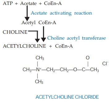with the help of ATP and coenzyme-A by the enzyme choline acetyl transferase present in the axoplasm. Hemicholinium blocks choline uptake (the