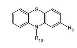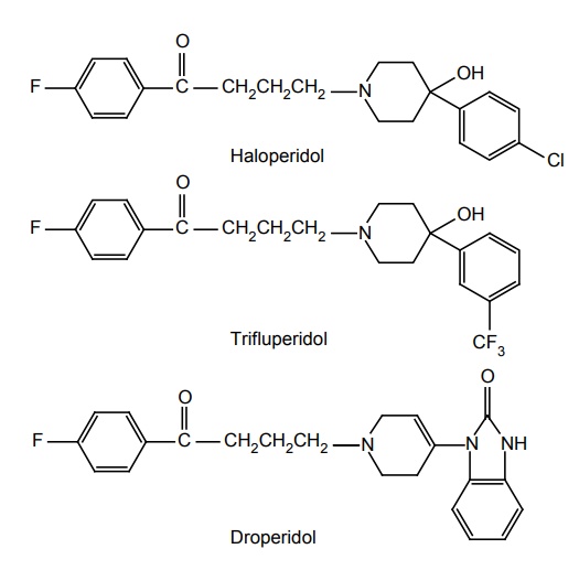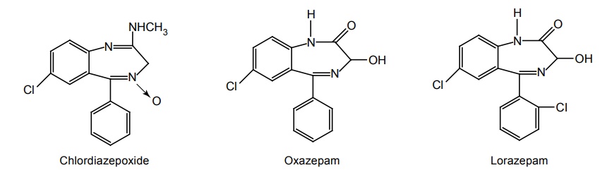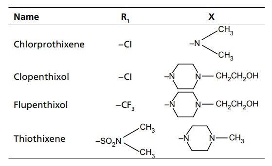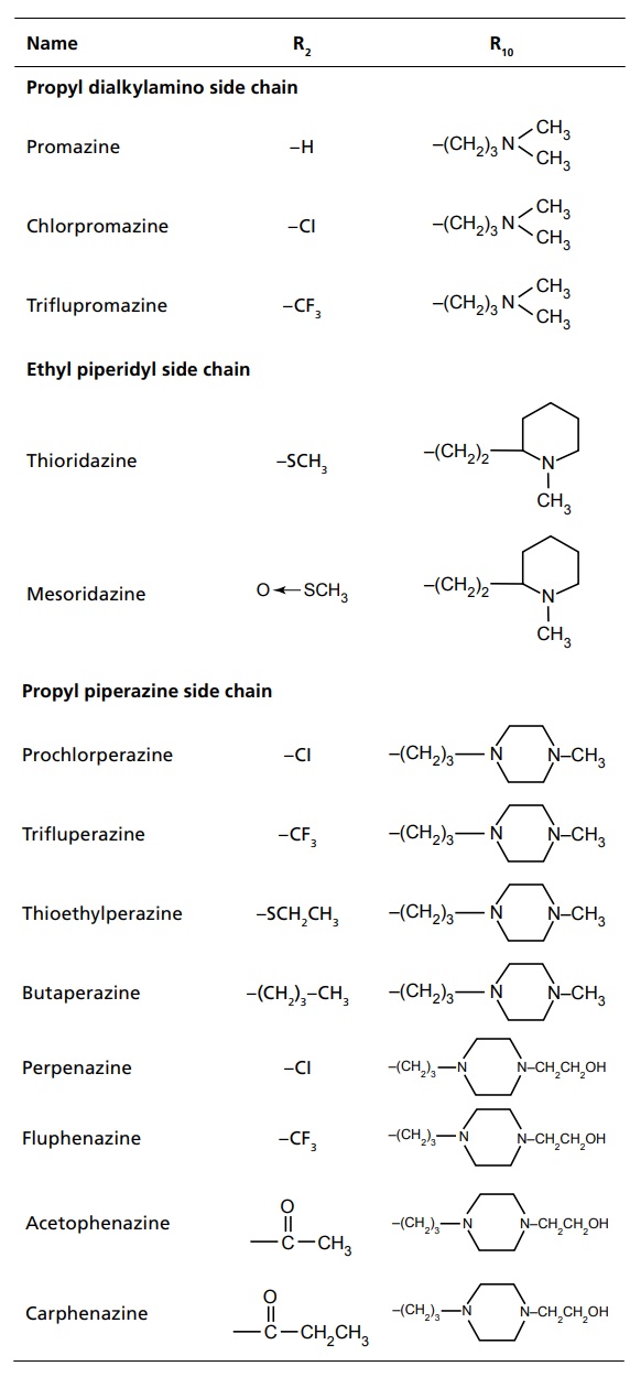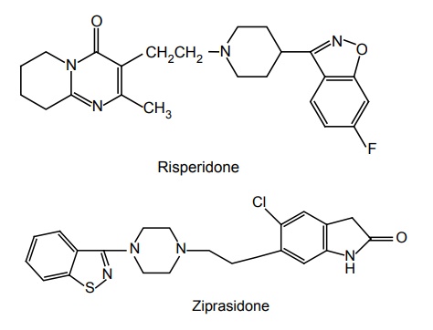 1. Phenothiazine derivatives 2. Benzodiazepines 3. Fluro butyrophenones 4. Rauwolfia alkaloids 5. Dihydroindolones 6. Thioxanthines 7. Dibenzoxazepines 8. Dibenzodiazepines 9. Diphenyl butyl piperidines a. Pimozide b. Penfluridat 10. Benzisoxazoles and Benzisothiazoles 11. Thienbenzodiazepines a. Olanzapine 12. Propanediol carbamates a. Meprobamate 13. Miscellaneous a. Oxypertine b. Quetiapine c. Seretindole