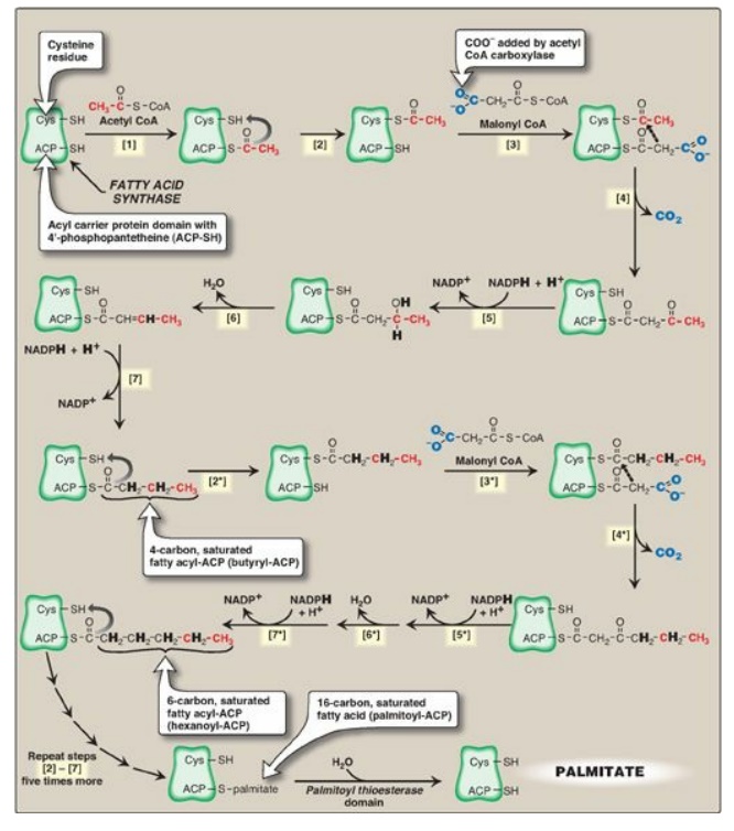 The result of these seven steps is production of a four-carbon compound (butyryl) whose three terminal carbons are fully saturated, and which remains attached to the ACP domain. These seven steps are repeated, beginning with the transfer of the butyryl chain from the ACP to the cysteine residue [2*], the attachment of a molecule of malonate to the ACP [3*], and the condensation of the two molecules liberating CO2 [4*]. The carbonyl group at the β-carbon (carbon 3, the third carbon from the sulfur) is then reduced [5*], dehydrated [6*], and reduced [7*], generating hexanoyl-ACP. This cycle of reactions is repeated five more times, each time incorporating a two-carbon unit (derived from malonyl CoA) into the growing fatty acid chain at the carboxyl end. When the fatty acid reaches a length of 16 carbons, the synthetic process is terminated with palmitoyl-S-ACP. [Note: Shorter-length fatty acids are important end products in the lactating mammary gland.] Palmitoyl thioesterase, the final catalytic activity of FAS, cleaves the thioester bond, releasing a fully saturated molecule of palmitate (16:0). [Note: All the carbons in palmitic acid have passed through malonyl CoA except the two donated by the original acetyl CoA, which are found at the methyl (ω) end of the fatty acid. This underscores the rate-limiting nature of the ACC reaction.]