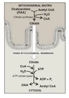 mitochondria into the cytosol, where it is cleaved into acetyl CoA and OAA by