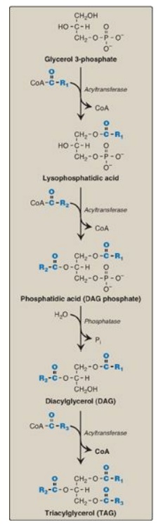 3-phosphate and fatty acyl coenzyme As: This pathway involves four reactions, shown in