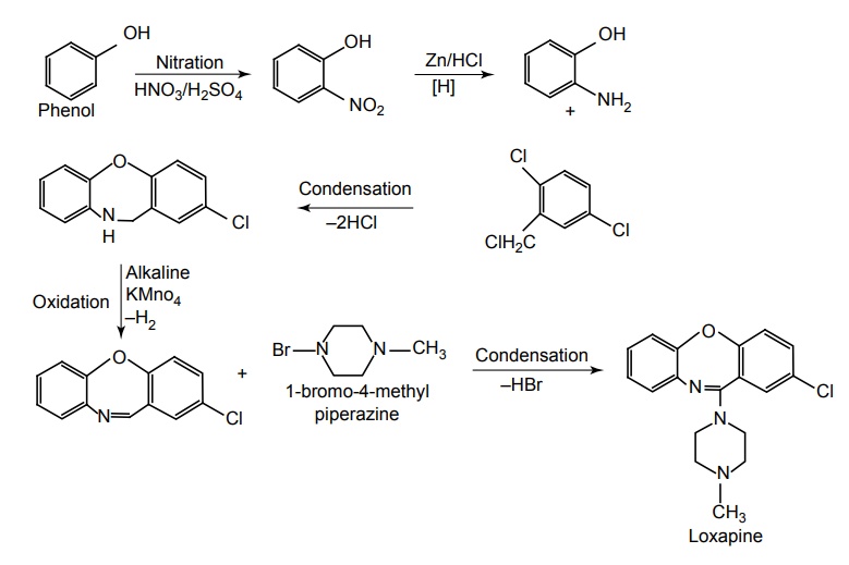 Properties and uses: Exist as white to off-white crystalline powder, slightly soluble in water or alcohol. It may give rise to possible anticholinergic and antiadrenergic activity. It must be employed with great caution in such patients who have either a history of glaucoma or urinary retention problems. It has resulted from the expansion of the six-member central ring of phenothiazine followed by isosteric replacement of one or more atoms with oxygen. Because of its seven-member central ring, the conformation of loxapine is more twisted than that of the phenothiazine rings. It is used for symptomatic control of schizophrenia.