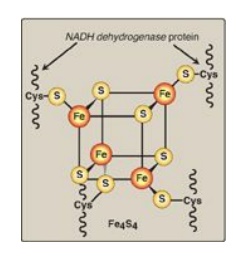 Figure 6.9 Iron-sulfur (Fe-S) center of Complex I. [Note: Complexes II and III also contain iron-sulfur centers.] NADH = nicotinamide adenine dinucleotide;Cys = cysteine.