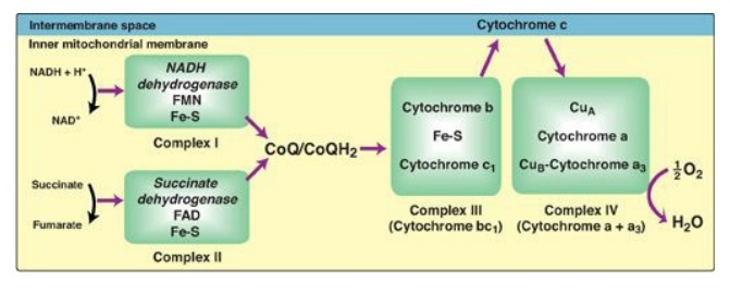 Figure 6.8 Electron transport chain. The flow of electrons is shown by the magenta arrows. NAD(H) = nicotinamide adenine dinucleotide; FMN = flavin mononucleotide; FAD = flavin adenine dinucleotide; Fe-S = iron-sulfur center; CoQ = coenzyme Q.