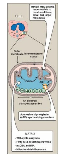 Figure 6.7 Structure of a mitochondrion showing schematic representation of the electron transport chain and the ATP synthesizing structure on the inner membrane. [Note: In contrast to the inner membrane, the outer membrane is highly permeable, and the milieu of the intermembrane space is like that of the cytosol.] mtDNA = mitochondrial DNA; mtRNA = mitochondrial RNA; TCA = tricarboxylic acid.