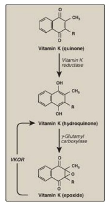 Figure 34.7 The vitamin K cycle. VKOR = vitamin K epoxide reductase.