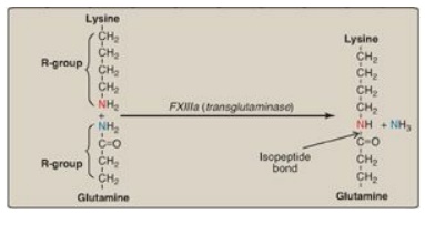 (insoluble) clot. FXIIIa, a transglutaminase, covalently links the γ-carboxamide