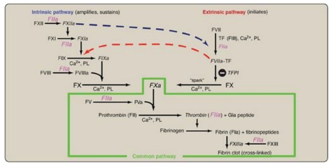 (FV, FI, FXIII), intrinsic (FXI, FVIII), and extrinsic (FVII) pathways (Figure