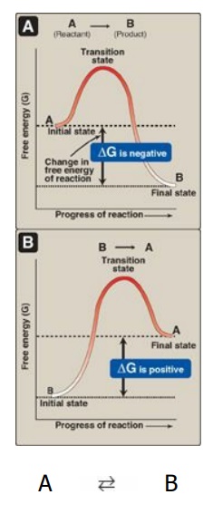 Figure 6.2 Change in free energy (ΔG) during a reaction. A The product has a lower free energy (G) than the reactant. B The product has a higher free energy than the reactant.