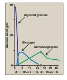 1. Increased glycogen degradation: Figure 24.11 shows the sources of blood glucose after ingestion of 100 g of glucose. During the brief absorptive period, ingested glucose is the major source of blood glucose. Several hours later, blood glucose levels have declined sufficiently to cause increased secretion of glucagon and decreased release of insulin. The increased glucagon-to-insulin ratio causes a rapid mobilization of liver glycogen stores (which contain about 80 g of glycogen in the fed state) due to PKA-mediated phosphorylation (and activation) of glycogen phosphorylase kinase that phosphorylates (and activates) glycogen phosphorylase. Figure 24.11 shows that liver glycogen is nearly exhausted after 10–18 hours of fasting, and therefore, hepatic glycogenolysis is a transient response to early fasting. Figure 24.12,1 , shows glycogen degradation as part of the overall metabolic response of the liver during fasting. [Note: Phosphorylation of glycogen synthase simultaneously inhibits glycogenesis.]