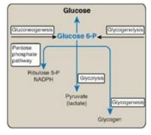 Figure 24.4 Central role of glucose 6-phosphate in metabolism. [Note: The presence of glucose 6-phosphatase in liver allows the production of free glucose from glycogenolysis and gluconeogenesis.] NADPH = nicotinamide adenine dinucleotide phosphate; P = phosphate.