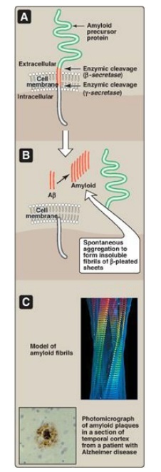 Formation of amyloid plaques found in Alzheimer disease (AD). [Note: Mutations