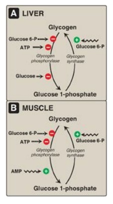 Figure 11.12 Allosteric regulation of glycogen synthesis and degradation. A. Liver. B. Muscle. P = phosphate.