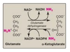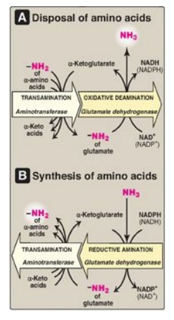a. Coenzymes: Glutamate dehydrogenase, a mitochondrial enzyme, is unusual in that it can use either nicotinamide adenine dinucleotide (NAD+) or its phosphorylated reduced form (NADPH) as a coenzyme (see Figure 19.11). NAD+ is used primarily in oxidative deamination (the simultaneous loss of ammonia coupled with the oxidation of the carbon skeleton, as shown in Figure 19.12A), and NADPH is used in reductive amination (the simultaneous gain of ammonia coupled with the reduction of the carbon skeleton, as shown in Figure 19.12B).