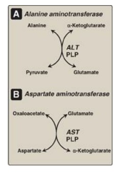 Figure 19.8 Reactions catalyzed during amino acid catabolism. A. Alanine aminotransferase (ALT). B. Aspartate aminotransferase (AST). PLP = pyridoxal phosphate.