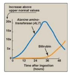 ALT and bilirubin in the plasma, following poisoning with the toxic mushroom