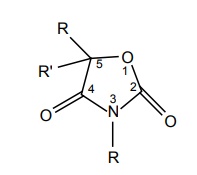 Replacement of the -NH group at position 1 of the hydantoin system with an oxygen atom yields the oxazolidine-2,4-dione system.