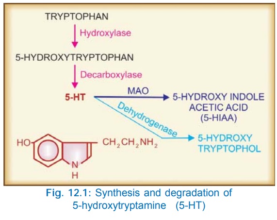5HT is βaminoethyl5hydroxyindole. It is synthesized from the amino acid tryptophan and degraded primarily by MAO and to a small extent by a dehydrogenase.
