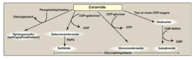 Figure 17.18 Overview of sphingolipid synthesis. UDP = uridine diphosphate; CMP = cytidine monophosphate; NANA = N-acetylneuraminic acid; PAPS = 3I -phosphoadenosine-5 -phosphosulfate.