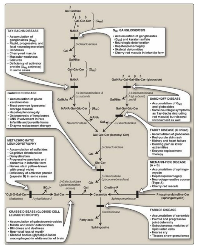 sphingolipids showing the lysosomal enzymes affected in related genetic