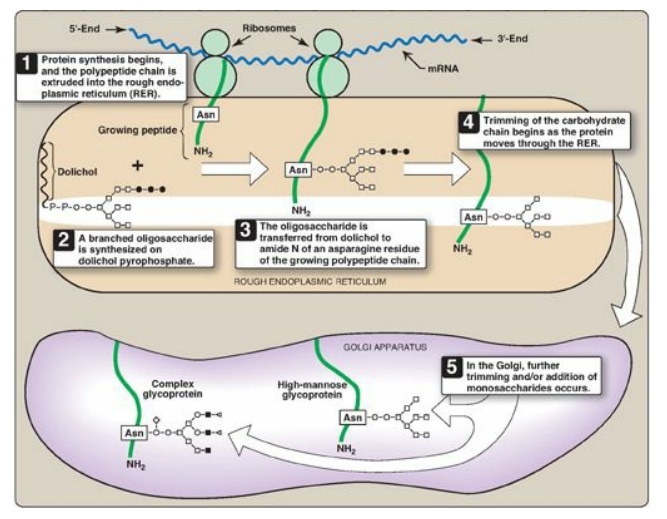 2. Final processing of N-linked oligosaccharides: After incorporation into the protein, the N-linked oligosaccharide is processed by the removal of specific mannosyl and glucosyl residues as the glycoprotein moves through the RER. Finally, the oligosaccharide chains are completed in the Golgi by addition of a variety of sugars (for example, N-GlcNAc, N-GalNAc, and additional mannoses, and then fucose or NANA as terminal groups) to produce a complex glycoprotein. Alternatively, they are not processed further, leaving branched, mannose-containing chains in a high-mannose glycoprotein (see Figure 14.16). The ultimate fate of N-linked glycoproteins is the same as that of the O-glycoproteins linked (for example, they can be released by the cell or become part of a cell membrane). In addition, N-linked glycoproteins can be targeted to the lysosomes. [Note: Nonenzymatic glycosylation of proteins is known as glycation.]