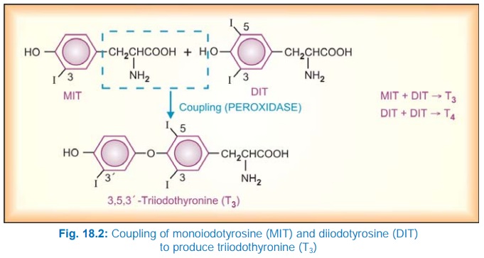 Pairs of iodinated tyrosil residues couple together (Fig. 18.2) to form T3